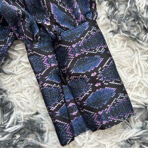 The unique blue and purple animal print covers the main body of this low cut wrap bodysuit blouse. The bottom section is black stretch jersey for full comfort. Cheeky bottom coverage. Attached neck-tie can be worn several ways. Snap at bust keeps the wrap in place. Deep zipper cuffs.