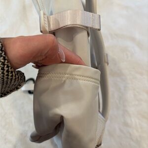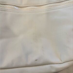 Stylish white backpack with adjustable straps. Features a front zip pocket and buckle details. Worn on one strip all stains noted in the photos.