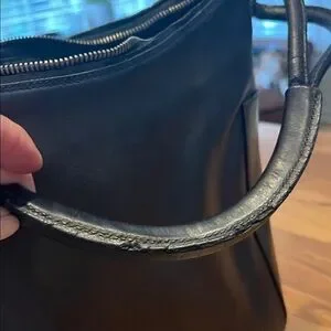 The strap and around the zipper has some wear but otherwise in great condition. Zipper works fine. The zipper pull has been added not original. Sleek black leather design. Perfect for everyday use. Comfortable shoulder strap.