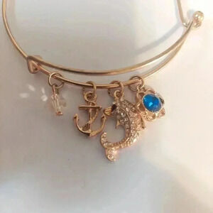 Gold tone BRACELET with 4 charms, Anchor, flower and cute dolphin with rhinestones.