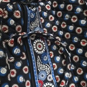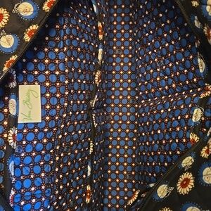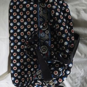Vintage Vera Bradley duffel gag. Retired "Night Owl" pattern. Cotton quilted. Dark navy/black background with owls/flowers. Sturdy base measures 14" x9" but bag is bigger than that. 2 handles and black shoulder strap. 2 large slip pockets on one side and large zip pocket on other. Top fully zips and inside are 4 slip pockets. It is in great condition.