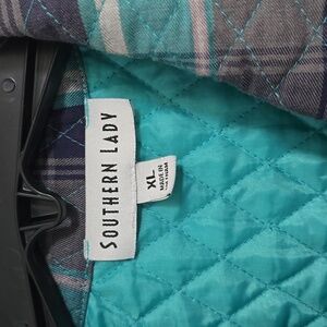 Chic quilted vest with a vibrant teal lining. Features a stylish plaid pattern. 2 hand pockets with snap. XL. Cotton/ polyester blend. Machine washable.