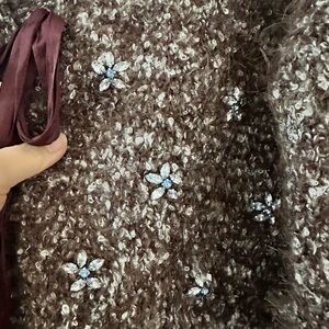 Super soft cropped cardigan with long cozy sleeves. She has crystal flowers sown on! So pretty!