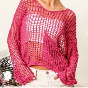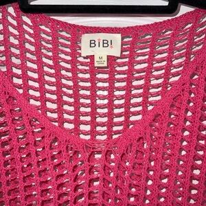 NWOT Bibi Hot Pink Mesh Knit Sweater w front pocket and flowy sleeves . Vibrant fuchsia open knit top. Ideal for layering. Lightweight and stylish. Great for beach.