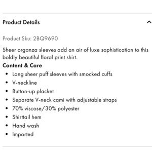 Boston Proper organza floral top with sheer sleeves. V neck and button front. Puffy balloon sleeves with smocked cuffs. Bust 19.5” waist 18” length 24”. New never worn. Excellent new condition. Size S