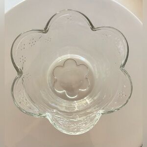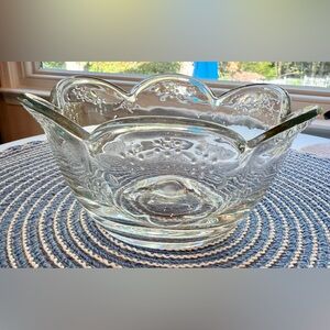 Beautiful Scalloped Edge Glass Dip/Serving Bowls are embossed with a floral pattern and a hint of blue in the glass. Perfect for serving dips, fruit, desserts or cereal!