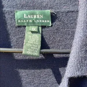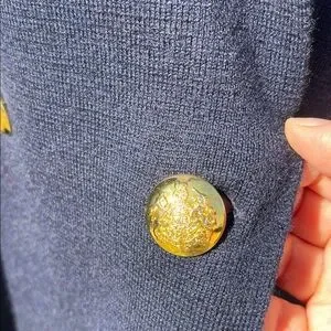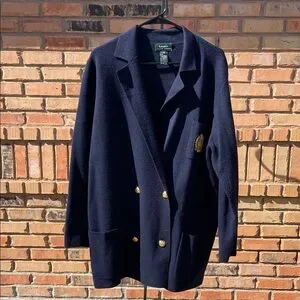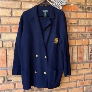 Sophisticated dark blue blazer by Ralph Lauren. Features striking gold buttons and emblem. Ideal for formal settings. 100% Merino wool