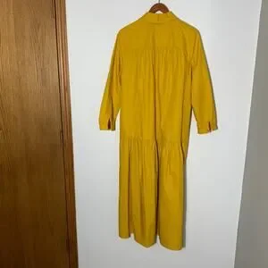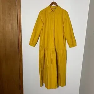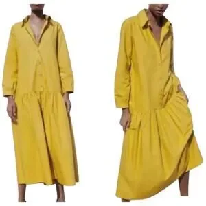 Absolutely gorgeous! Womens Zara Poplin Maxi Dress, mustard yellow, long sleeve, collared, button top, long length, oversized, pockets, drop waist. Size S EUC!