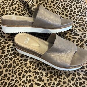 Stylish Eileen Fisher mules in shimmering silver. Perfect blend of comfort and great to begin fall! Very little wear.