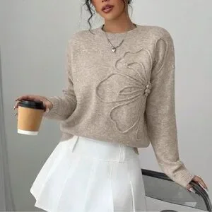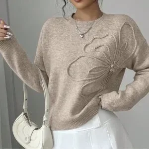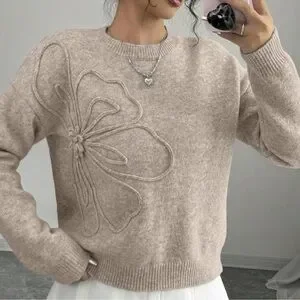 Classic Floral Textured Round Neck Knit Sweater Top S M L