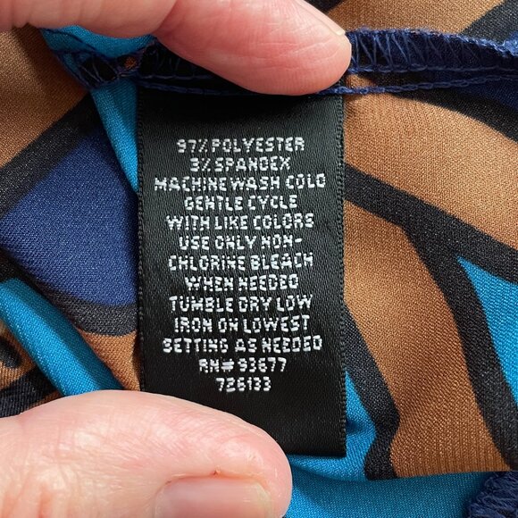 Size Large Nicole by Nicole Miller blue brown black silky top with tie at waist. The perfect work/office blouse! Silky, flowy material with V-neck and cap sleeves. Gorgeous blues, browns and black. Pairs nicely with pants or skirts and can be dressed up or down.