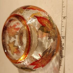 Yankee Candle Crackle Glass Tealight Holder, with a beautiful fall leaves pattern. It has an orange band around the top and bottom. New in the box.