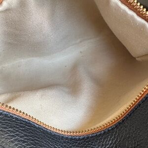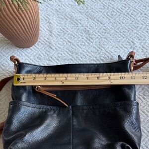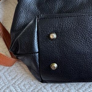 Chic black leather with tan strap. Gold-tone hardware. Perfect for everyday use.