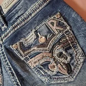 Chic boot cut jeans with intricate back pocket design. Light blue hue for versatile styling, Stretchy material, fits sizes 23-24