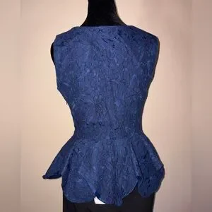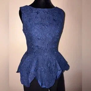 Elegant navy blue sleeveless lace top with floral design. Features a flattering peplum silhouette. Fully lined top. Side zip.