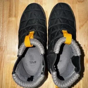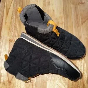 Stay cozy and stylish with these Teva Ember Mid Moc boots in classic black with gray and mustard accents. Designed for comfort and versatility, these quilted slip-on boots feature a cushioned footbed, collapsible heel, and durable rubber sole — perfect for lounging, travel, or light outdoor adventures.