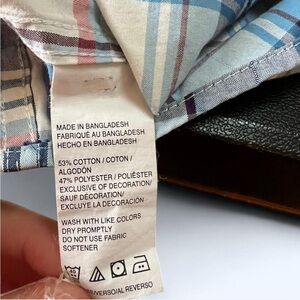 Classic blue, red, and white pattern and fits well in a medium. Great for wearing on its own or layering, it’s comfortable and versatile for any casual look