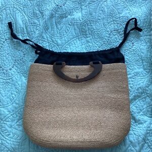 This Helen Kaminski , Australia has a tan raffia outer, a black lining made of 100% linen, plus a dark brown plastic curved handle. This bag is perfect on a warm summer day.