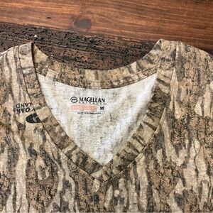 Classic V-neck tee with woodland camo pattern. Ideal for outdoor wear. Soft and breathable fabric.