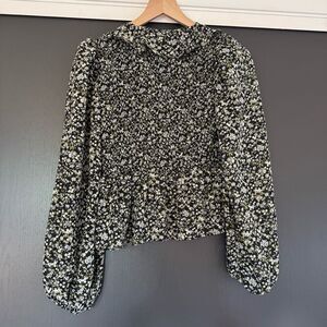 ASTR The Label Black Blue Ditsy Floral Peasant Preppy Chiffon Ruffle Long Sleeve Top Size S