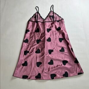 Charming pink nightgown with black heart prints. Features delicate black lace trim for a touch of elegance. Perfect for a cozy night's sleep. 16” ptp, 32 length, Polyester, Size S