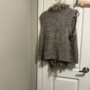 This is a knitted vest with a faux fur collar from Chico's brand.