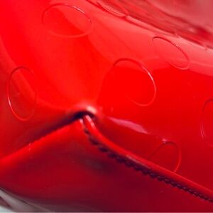 Kate spade medium tote in orange-red/dark coral with debossed polka dots. Cute bow and gold tone spade on front. Zipper top closure. Very minor rub on bottom edge and teensy rub spot on one corner. Clean interior with two slip pockets. Measures about 12x10x3.5”. Dual handles with about 7” drop.