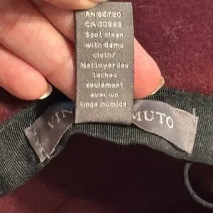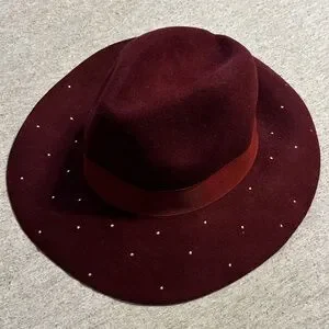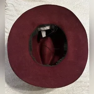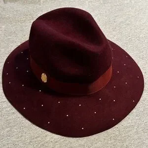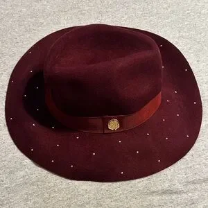 In excellent condition just needs some love & reshaping from storage. Stylish burgundy fedora by Vince Camuto. Features elegant gold accents. Ideal for adding flair to any outfit. The perfect addition to your wardrobe!