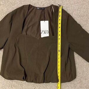 Chic greenish brown top by Zara. Features a unique neckline and long sleeves. Perfect for any occasion.