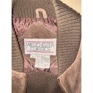 Keywords: Westchester Classics jacket, suede jacket women, knit sleeve jacket, brown bomber jacket, vintage bomber jacket, retro suede jacket, women's large jacket, suede and knit jacket, casual jacket, fall jacket, winter jacket, zip up jacket, ribbed jacket