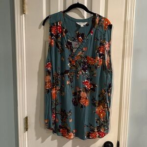 Chic sleeveless blouse with vibrant floral design. Teal base with colorful accents. Perfect for casual outings.