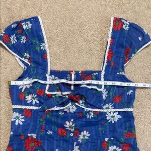Stylish blue top with floral design. Features white accents and intricate detailing. Large. Measurements in pictures.