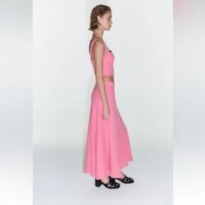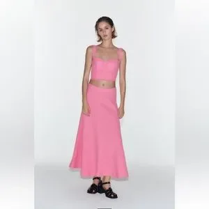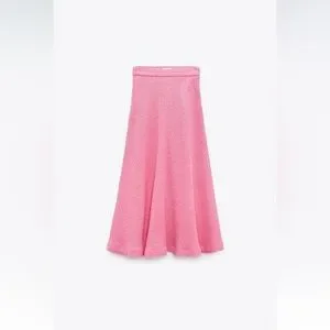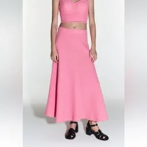 High Waisted long skirt. Textured fabric detail. A-line silhouette. Hidden in-seam zip closure.