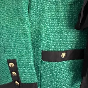 Only worn once. Excellent condition. Chic green mini dress with black accents. Features gold button details. Perfect for stylish outings.