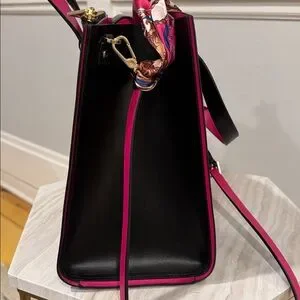 Add a pop of color to your wardrobe with this stunning black leather Kate Spade tote, featuring vibrant pink handles and detailing. Perfect for both casual outings and professional settings.