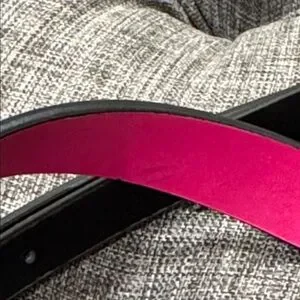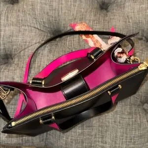 * Sleek black leather exterior with bold pink handles and strap