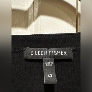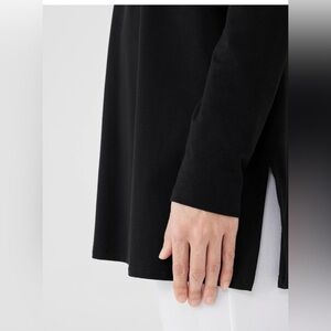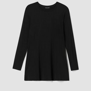 This is a beautiful and hard-to-find Eileen Fisher 100% silk black crew neck pullover shirt with full-length sleeves, perfect for layering or wearing on its own for a minimalist, chic look.