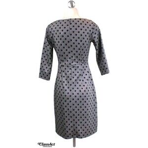 This Talbots dress is a stylish and classic piece perfect for various occasions. It features a crew neckline, 3/4 bell sleeves, and a knee-length sheath silhouette with a faux wrap design in a black polka dot pattern. The dress is accented with a back zipper for closure and is made from stretchy polyester fabric, offering comfort and ease of movement. Designed as a petite small size, this dress is suitable for workwear, business events, parties, cocktails, or even for traveling in style.