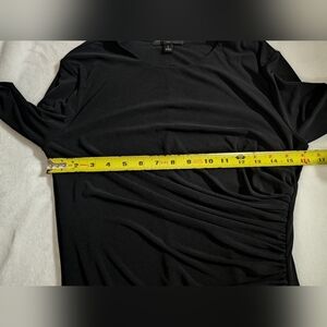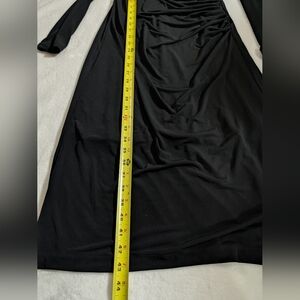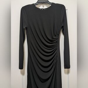 This elegant black dress features a sophisticated draped design, perfect for any occasion. The long sleeves add a touch of class, making it a versatile addition to your wardrobe.