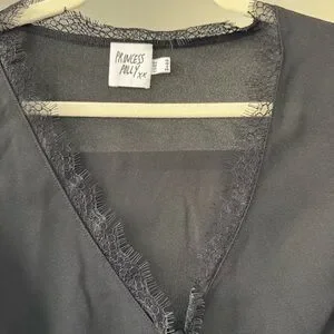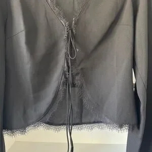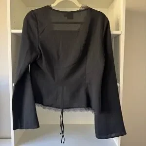 Size US 6. Long sleeve top. Flared sleeves, lace trim detail, open front design, three tie fastenings at front.