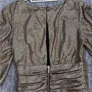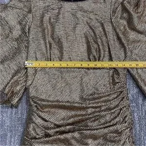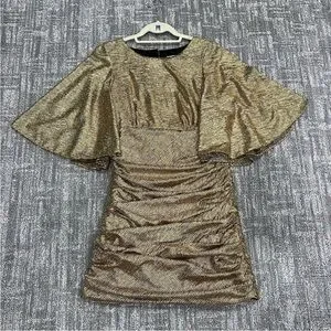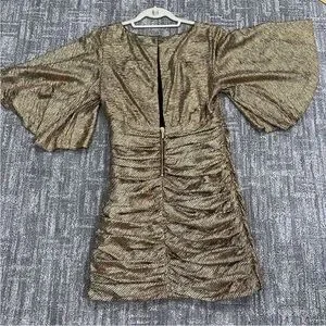 Dazzle in this metallic gold mini dress. Features dramatic flared sleeves. Ideal for standout moments.