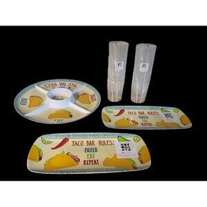 Novogratz set includes two serving trays measuring 14 3/4” x 6 1/2” and one chip-and-dip tray measuring 15 1/2”. The design features “Taco Bar Rules Build Eat Repeat” in a multi-color style. All pieces are break/chip resistant, dishwasher safe, and made for convenience. Also included are eight 12 oz acrylic bubble stacking tumblers. You’ll receive 11 brand new pieces in total.