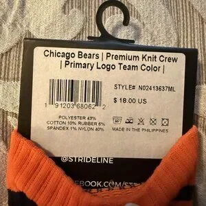 This product is a lot of 2 Strideline Crew Socks featuring the Chicago Bears NFL football team. The socks are in a size M/L (men's 8-12) and are made of polyester, nylon, cotton, rubber, and spandex. They are multicolored and have a mid-calf length with a full toe style. These cushioned socks are ideal for various sports activities including football, basketball, tennis, golf, and more. Machine washable and made in the Philippines, these socks provide comfort and style for any casual occasion. Brand New with Tags. Shipped with USPS. From a smoke free and pet free home. Retails for $18 per pair.