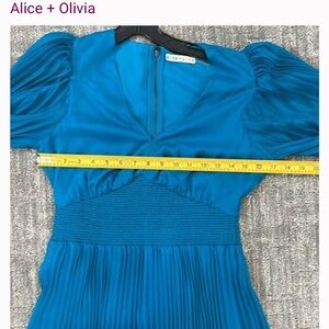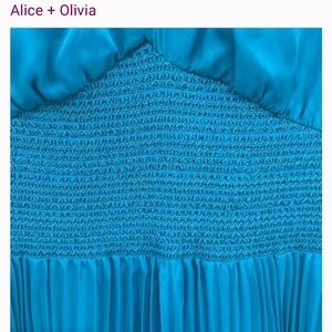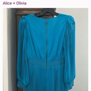 Chic blue dress by Alice + Olivia. Features long sleeves and pleated design. Ideal for stylish events.
