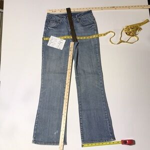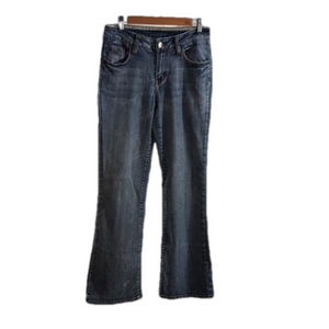 FEATURES/ACCENTS: Classic fit. YKK Zipper & metal (name brand) button closure. Rivets (name brand). Mid-Rise. Flared Legs. 5 Pockets: 2 front slip pockets, 1 watch pocket, & 2 back metal snap pockets. Color: Stonewashed Denim Blue.