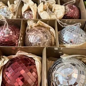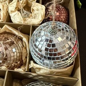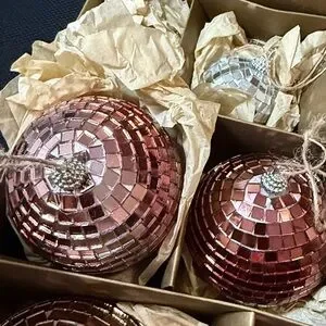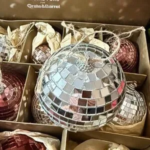 Stevey Crate and Barrel Leanne Ford. Add sparkle to your holiday decor with Crate&Barrel's disco ball ornaments. Featuring vibrant rosy red, shimmering silver, and elegant pink, these ornaments bring festive charm. Great condition. Original box.