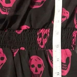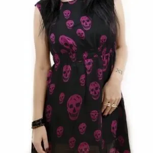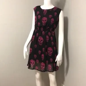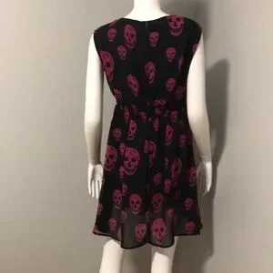 Bold black dress with striking pink skulls. High low hem for a unique look.