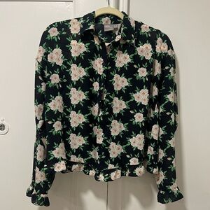 Us size 4 , women’s size small long sleeve collared blouse in black green and pink floral design with buttons. Worn a few times. From ASOS