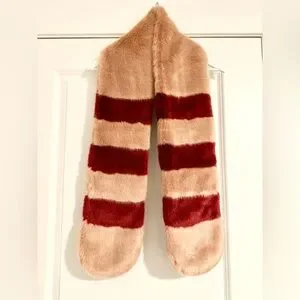 Stylish light pink faux fur winter scarf / wrap with bold burgundy stripes. Soft and warm - the coziest fashion accessory. Perfect for adding a pop of personality to your outfit.