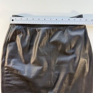 Description: Black leather pencil skirt with mid-to-high waist. Straight hemline that falls around mid-thigh with back slit. Zipper and button closure with nylon lining.